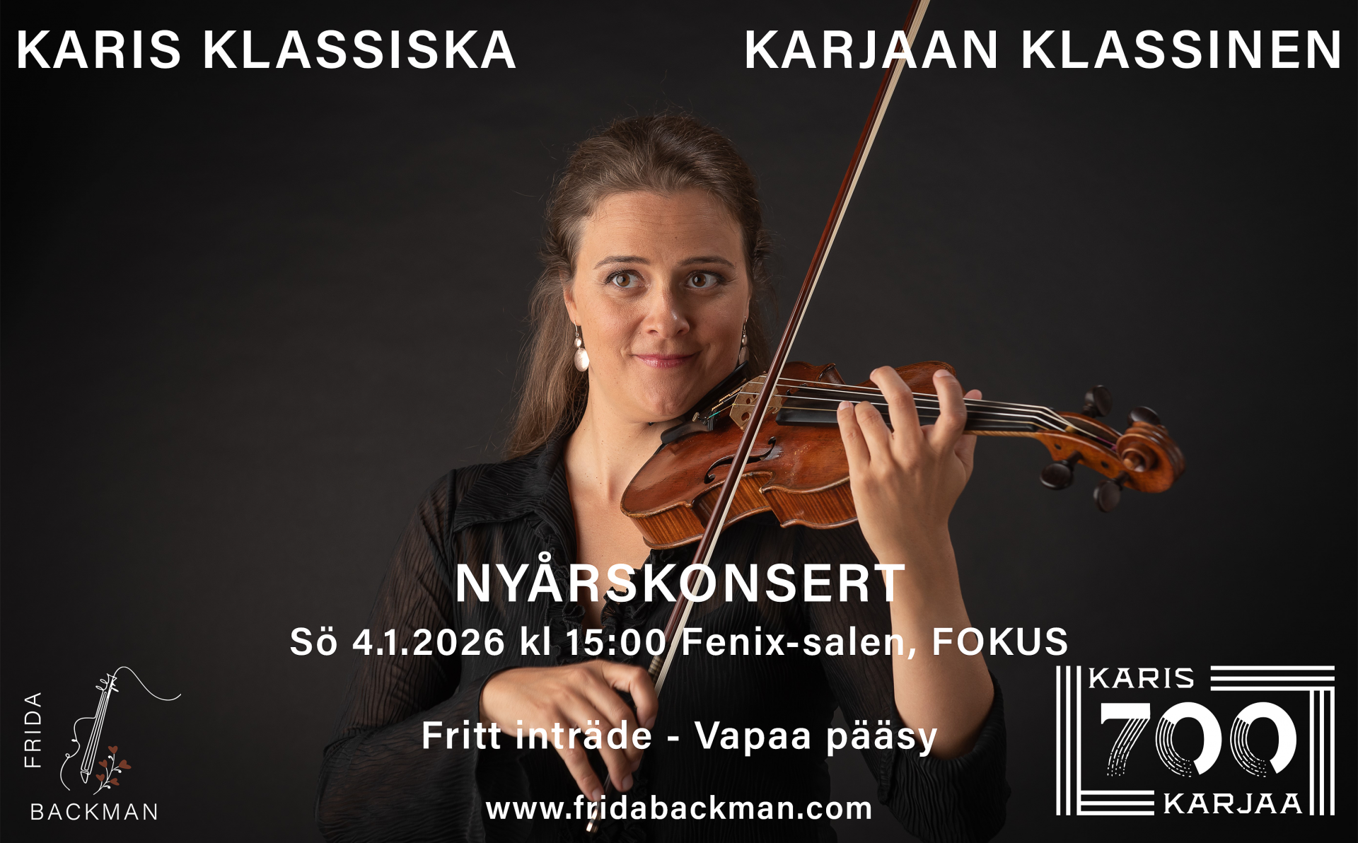 Karjaa 700 juhlitaan pitkin juhlavuotta 2026 sarjalla klassisen musiikin ilmaiskonserteilla Karjaan FOKUS-kulttuuritalon Fenix-salissa. Yhdistys Villa Frida musiikinystävät kutsuvat kaikenikäiset musiikinystävät mukaan nauttimaan kauniista musiikista. Onnea Karjaa!